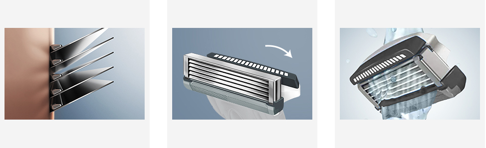 Được trang bị 5 lưỡi cạo giúp cạo sát với những đường cạo ngắn: Bạn có thể cạo sạch tất cả cùng một lúc trong thời gian ngắn. Bộ phận bảo vệ da kiểm soát chuyển động trên da, giúp việc cạo râu trơn tru hơn và bảo vệ làn da khỏi bị kích ứng.