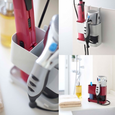 - Giá đựng máy sấy tóc có thể được gắn vào cửa bồn rửa và gương. Sản phẩm với thiết kế nhỏ gọn và lại còn có thể treo tường nên có thể giúp bạn tiết kệm tối đa không gian trong nhà.