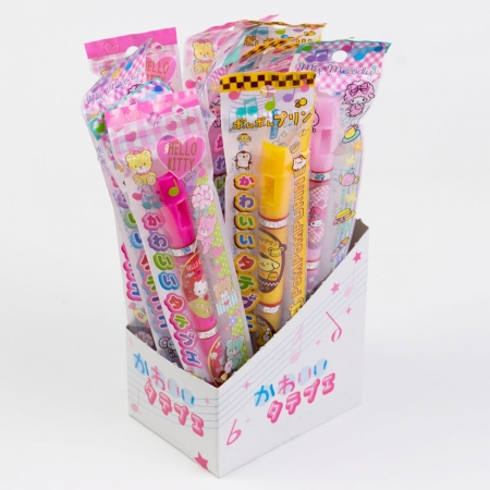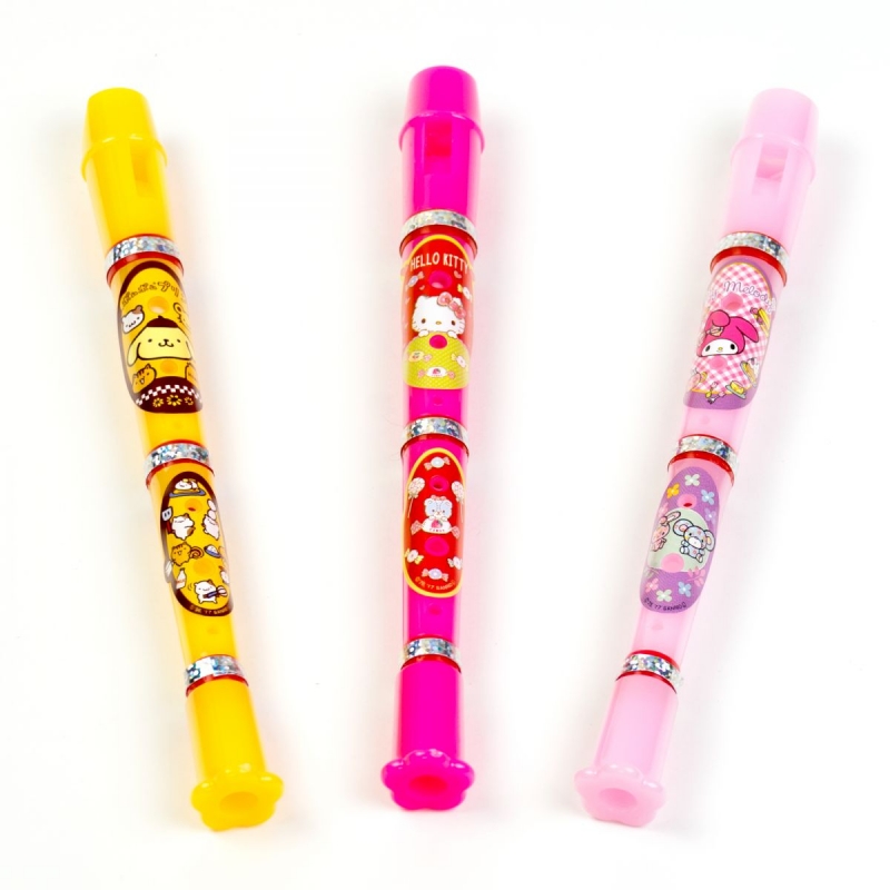 Kẹo đồ chơi kèm thổi sáo in nhân vật dễ thương Hello Kitty, My Melody và Pom Pom Purin. Bé có thể chơi một giai điệu vui nhộn bằng cách thổi sáo.