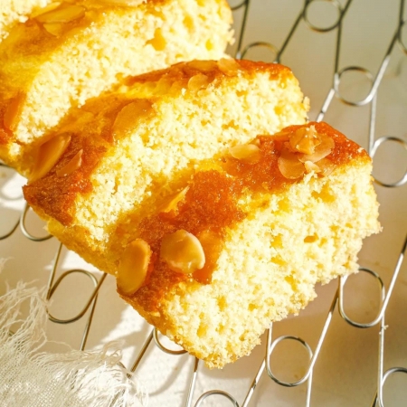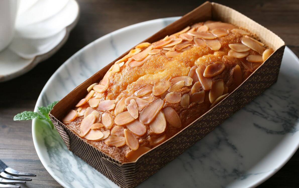 - Hạnh nhân California thơm ngon được rang, thái lát siêu mỏng và rắc lên bánh pound cake để tạo nên kết cấu ẩm và xốp.