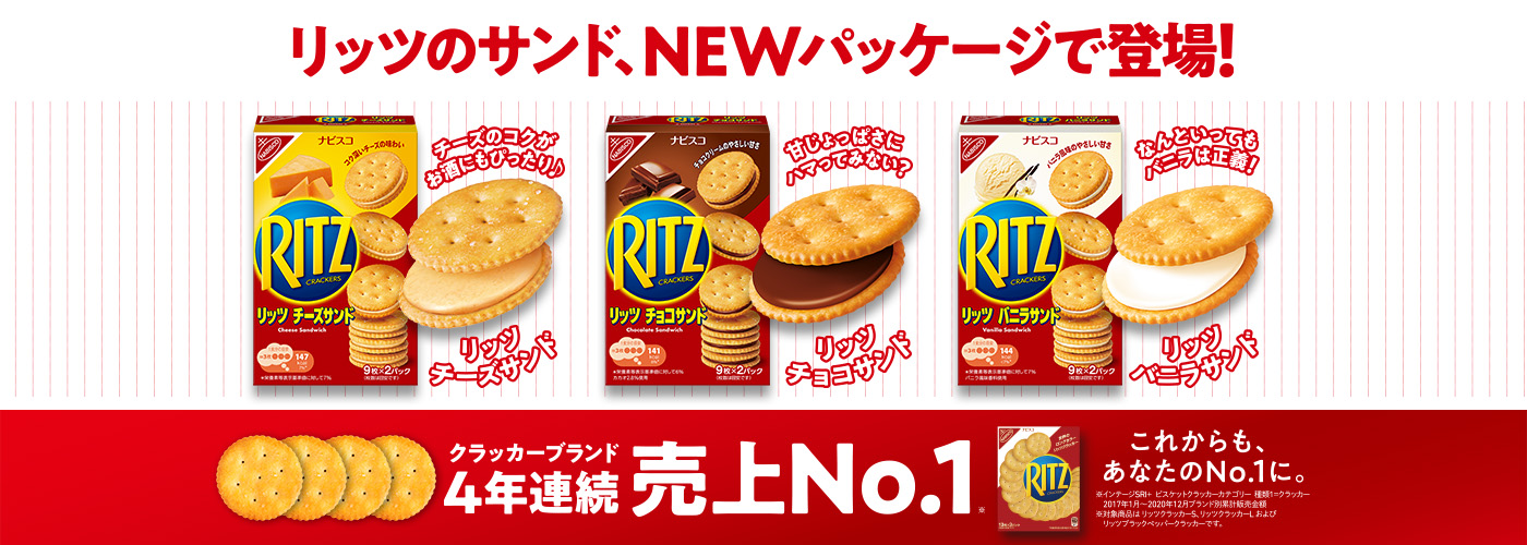 Ritz là một trong những thương hiệu bánh lâu đời và bán chạy nhất trên thế giới. Bánh Ritz nổi tiếng nhờ công thức đặc biệt cho lớp vỏ bánh giòn tan. Có 3 phiên bản bánh Ritz gồm nhân kem vani, phô mai và socola cho bạn thêm chọn lựa.