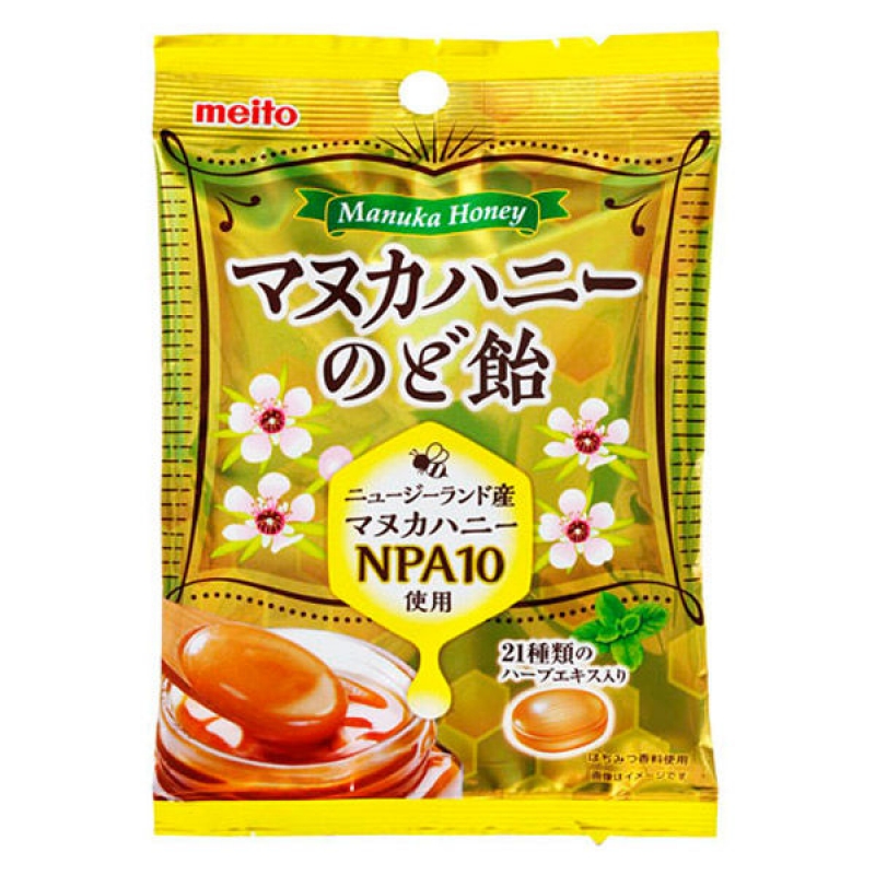 Kẹo ngậm thông họng mật ong Manuka Meito hỗ trợ trị viêm họng, giàu dưỡng chất được làm từ mật ong Manuka New Zealand NPA10 và 21 loại chiết xuất thảo dược.