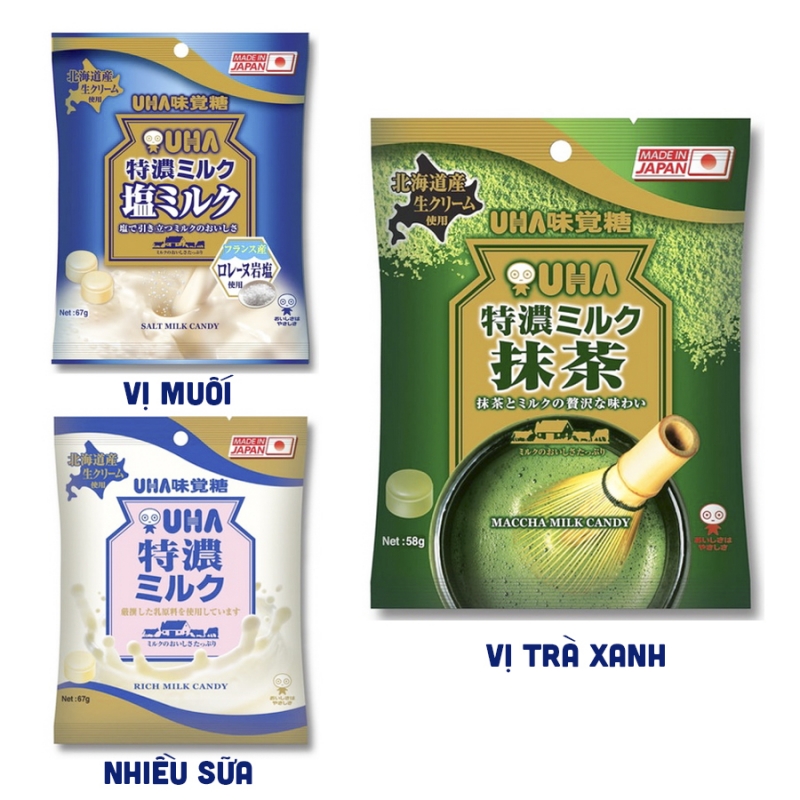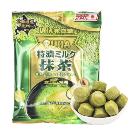 1. Kẹo trà sữa xanh UHA Nhật Bản với vị béo, thơm ngon, rất thơm mùi trà xanh nhưng không đắng với vị sữa hòa quyện. Sản phẩm thuộc UHA - một trong những nhãn hiệu chuyên sản xuất bánh kẹo best-seller tại Nhật Bản.