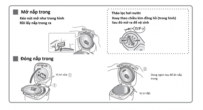 Thường xuyên vệ sinh nắp trong để đảm bảo không có vật lạ hay hạt cơm bám dính vào gây hiện tượng tắc nghẽn lỗ thoát hơi nước và van an toàn. Điều này cần chú ý vì nó ảnh hưởng đến sự an toàn của chính chúng ta.